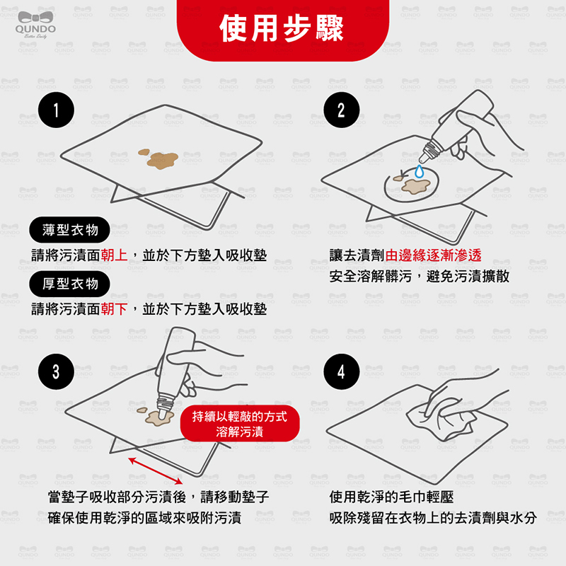 使用方式:取適量去漬液擠出至欲清潔之衣物上。